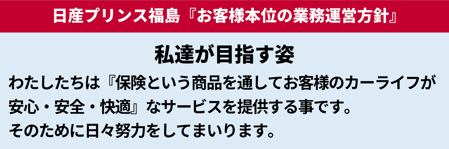 • 当社は、お客様の安心・安全なカーライフと最善の利益を第一に考え、高度の専門性と職業理念を保持し、お客様に誠実・公正に業務を行うよう努めてまいります。