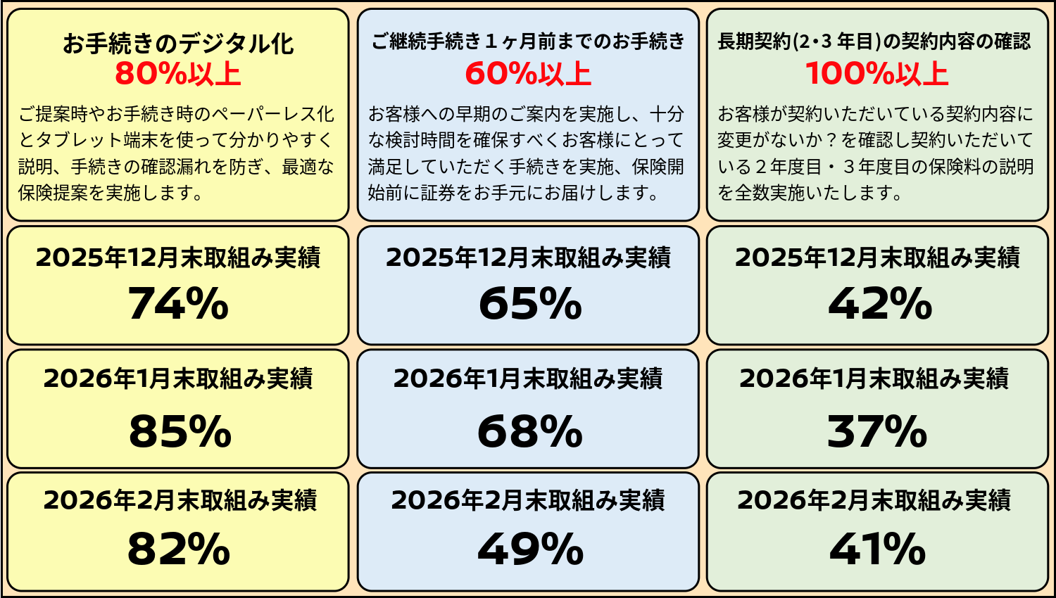 • 当社は、お客様のご意向を正確に確認、把握し、その上で社会環境の変化も考慮しながら、お客様にとって最良・最適なご提案を実施いたします。継続手続きについてもお客様に早期にご案内を実施し安心と信頼をご提供いたします。